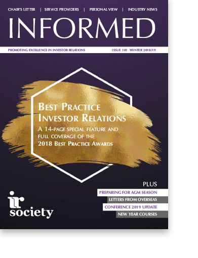 The main feature in the Winter 2018/19 issue of Informed was the 13-page feature, including photos, on the IR Society Best Practice Awards, which was held at The De Vere Grand Connaught Rooms. Every prize winner and sponsor was featured along with photographs of this wonderful event.