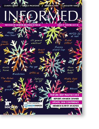 Also in this issue, Sean Ellerker of QuantiFire presents the annual member survey, Richard Davies of RD:IR shares his thoughts about IR in 2018 and Swen Lorenz of Master Investor outlines the importance of retail investors.
