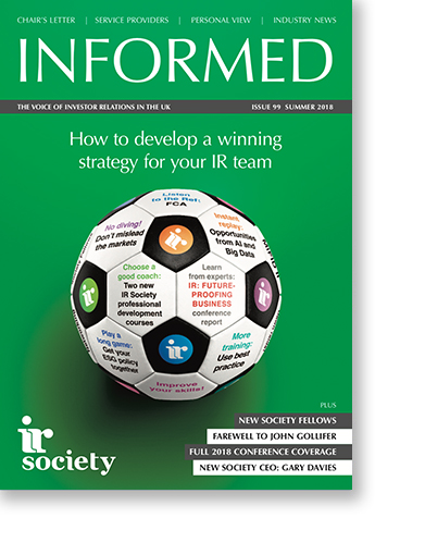The main feature in this issue of Informed reports on the IR Society’s 2018 annual conference, IR: Future-proofing Business, which took place on June 19th. The 28-page feature contains write-ups from each session, including interviews with Sir Douglas Flint, former group chairman of HSBC Holdings, and Sir Michael Rake, former chairman of Worldpay Group. This section also includes photographs and cartoons from the event.